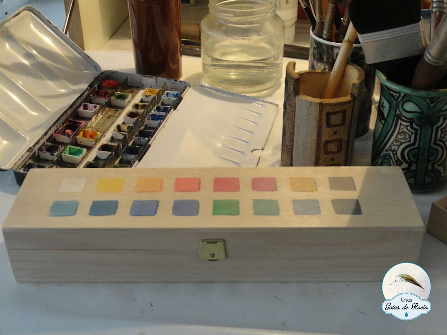 A continuación le tocó al abuelo, su caja recopila su pasión por los colores y la pintura. Desde niño mi padre ha interpretado el mundo a través de un pincel. Lo efímero de la acuarela ha sido su pasión. La sencillez de la caja que le ha preparado mi hermana es fiel reflejo de un modo de vida que nos ha sabido transmitir.