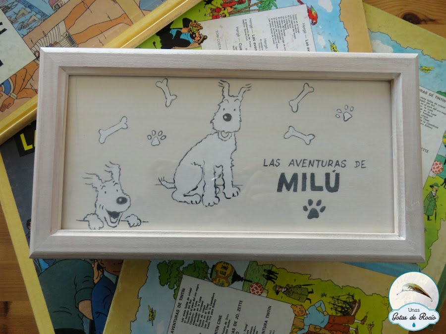 El primer regalo, si bien me sorprendió, entraba dentro de lo posible. Se trata de una caja de madera teñida de blanco envejecido con una ilustración de Milú en la tapa hecha por ella.