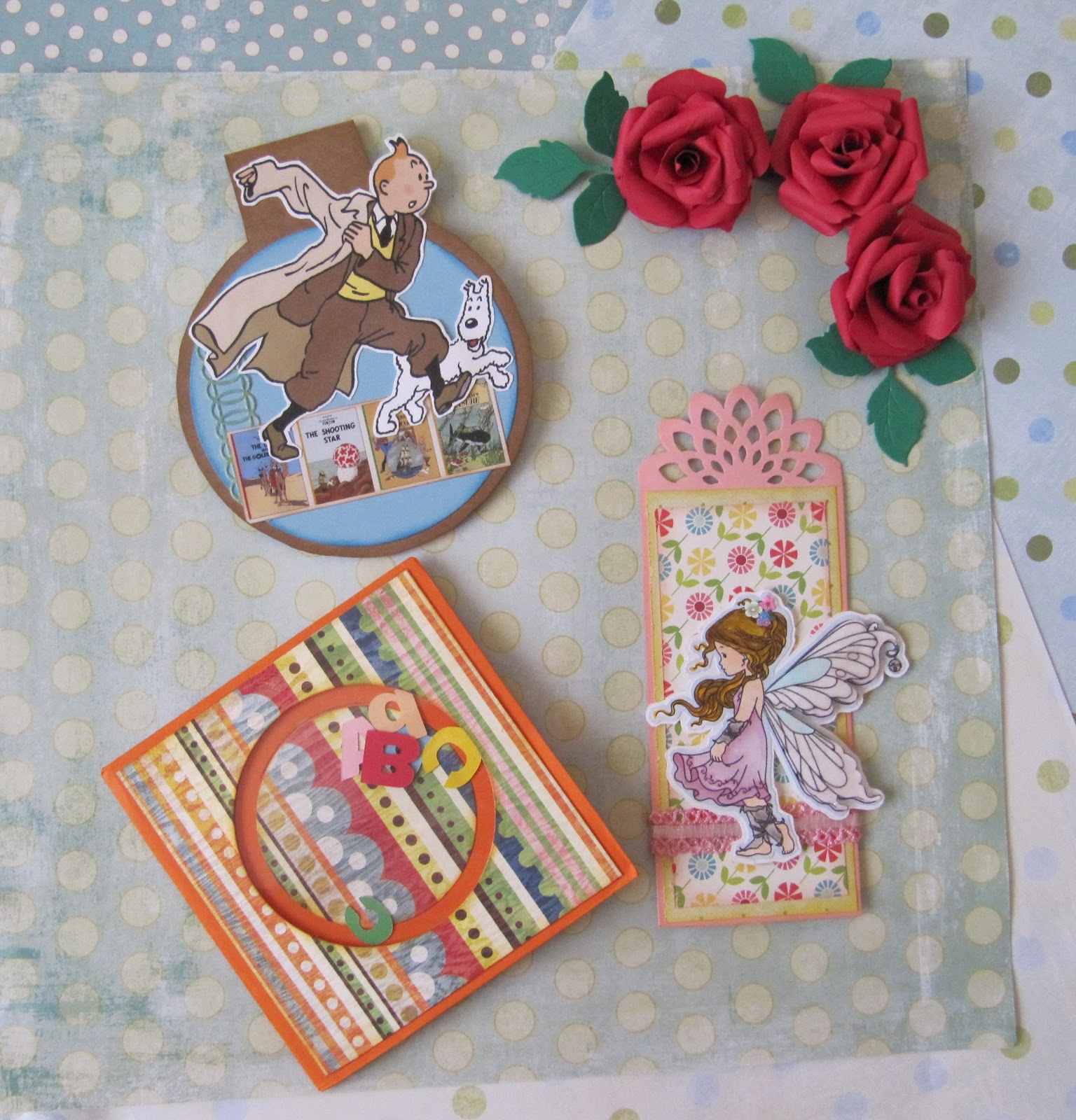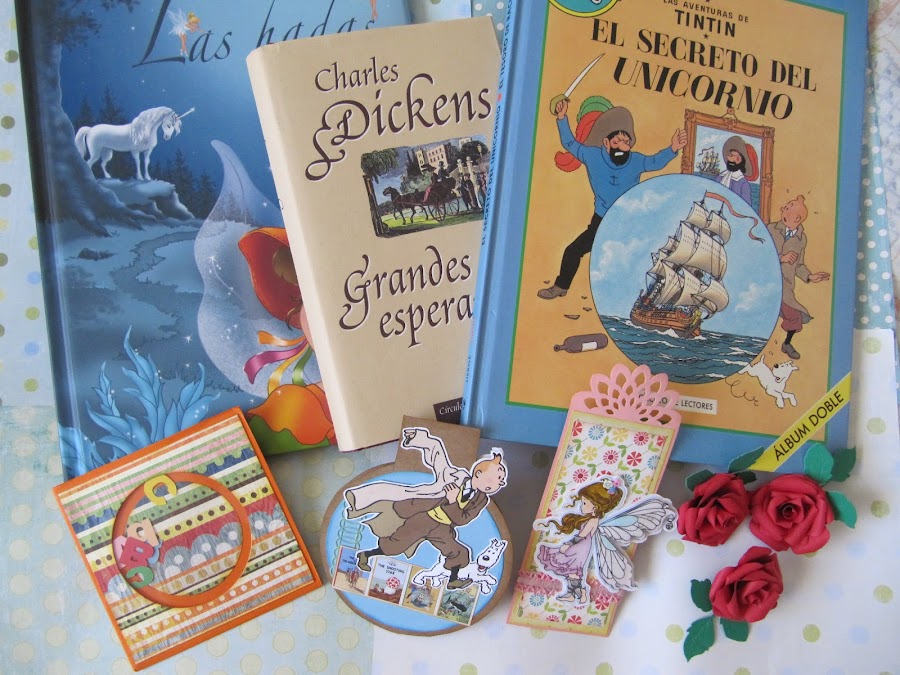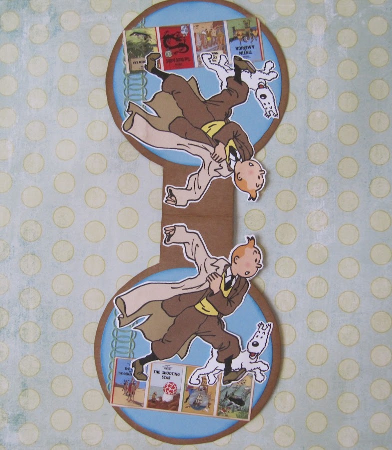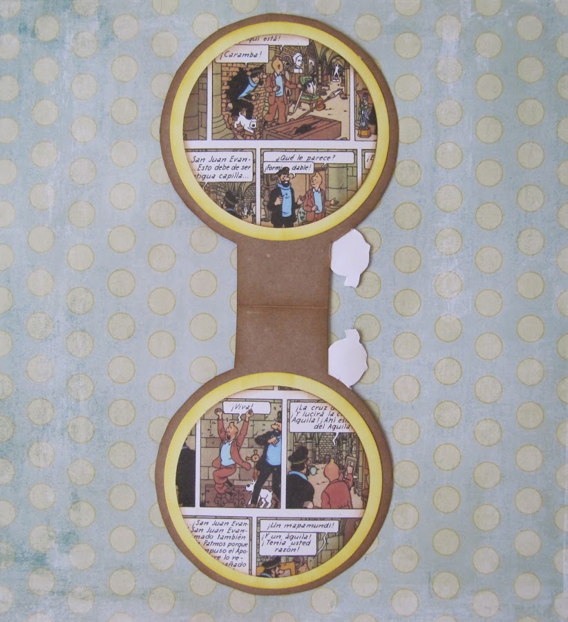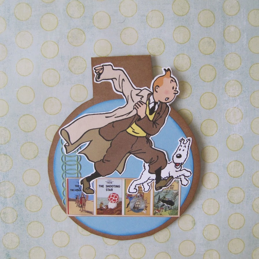 --- Cartón fino de color marrón, recorte los círculos a tijera porque quería que estuviesen unidos por una lengüeta que la he plegado. --- Los circulos del interior son cortados con la Big Shot, entintados los bordes. --- Las imágenes de las tapas de los libros son imágenes de la red; igual que la de Tintin, imprimiéndola una normal y otra a la inversa para que cuando este cerrado el marcapáginas coincidan