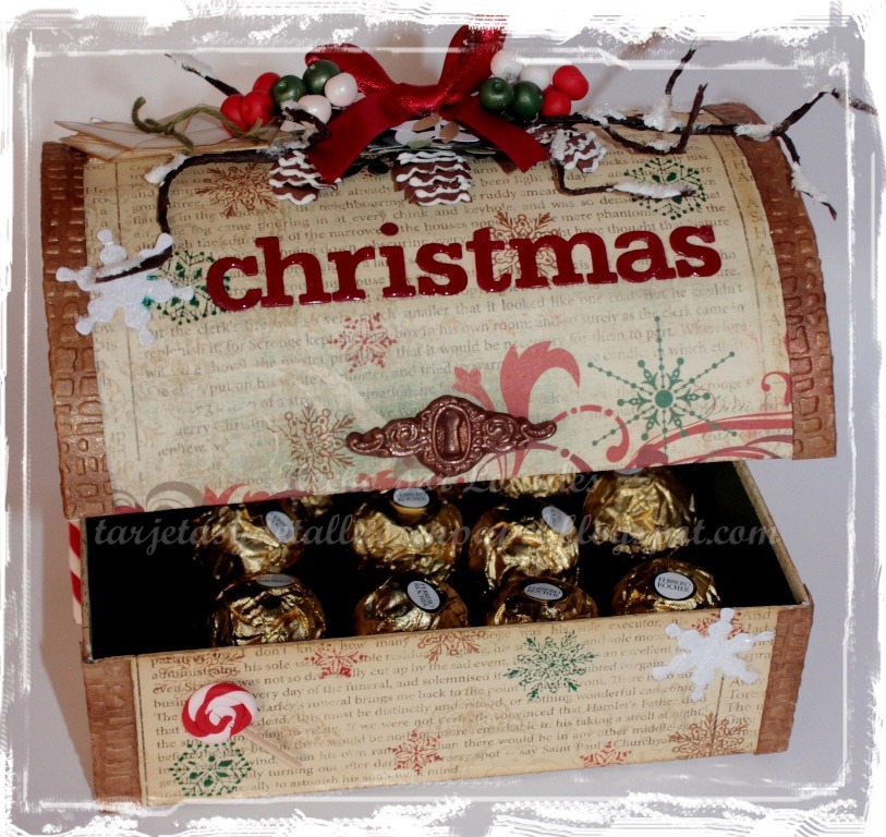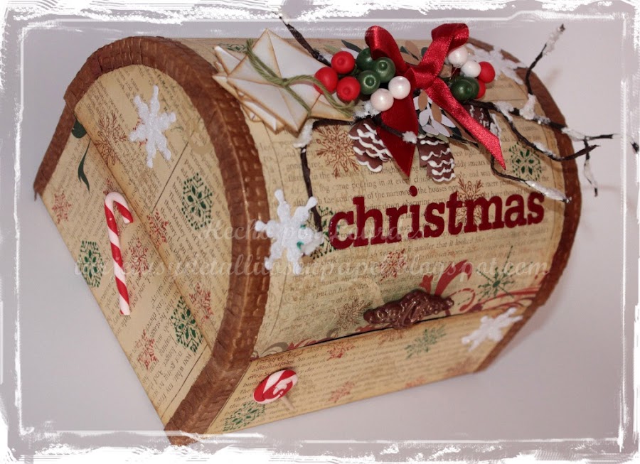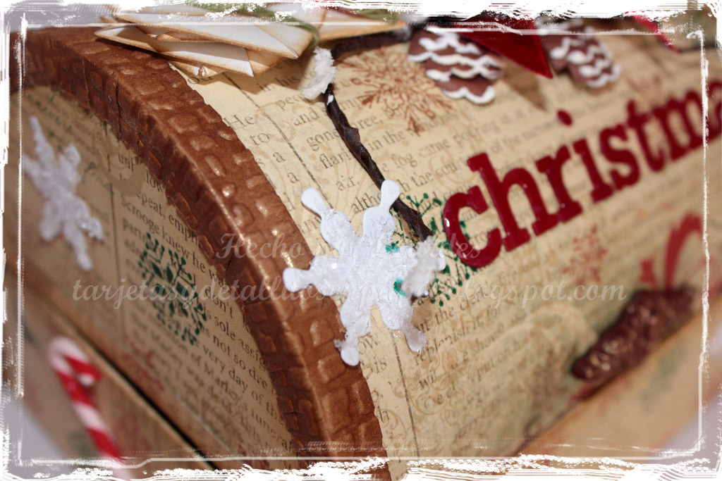 El baúl, completamente hecho a mano fue decorado con papeles de la colección de Bo Bunny, Rejoice, la cual es muy tradicional (tal como me gusta). Los adornos que se pueden observar sobre toda la superficie del baúl, están hechos completamente a mano, usando un poco de arcilla polimérica, Perfect Pearls Green Patina para darles brillo, unas piñas hechas a mano y una cerradura hecha con arcilla polimérica cubierta con Perfect Pearls Bronze.