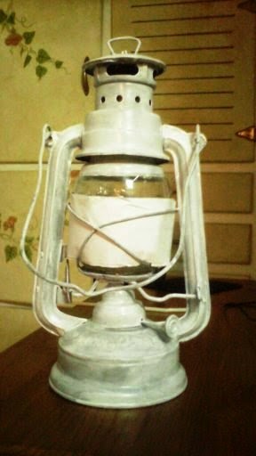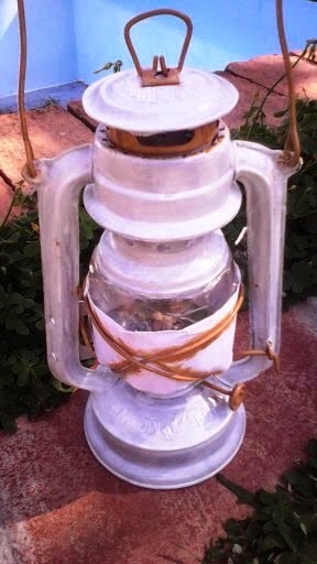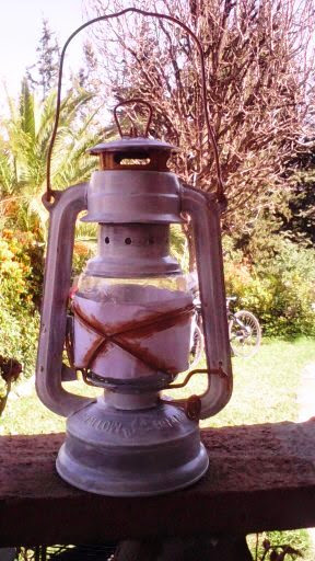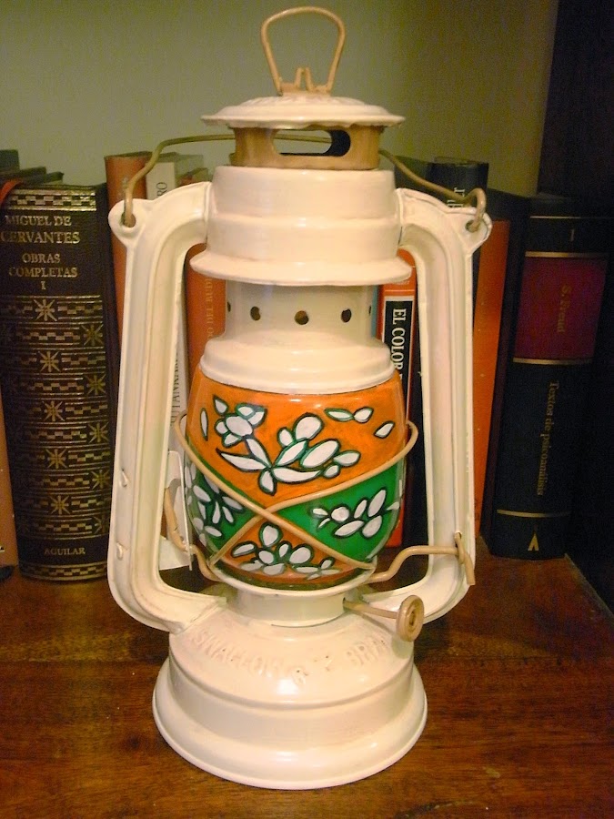 Originalmente era un quinqué de latón algo oxidado Se protegió el cristal y se le dieron dos manos de imprimación blanca Los herrajes se pintaron de acrílico color gamuza