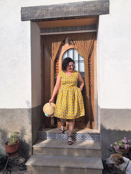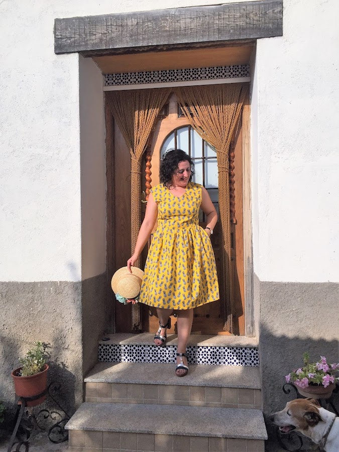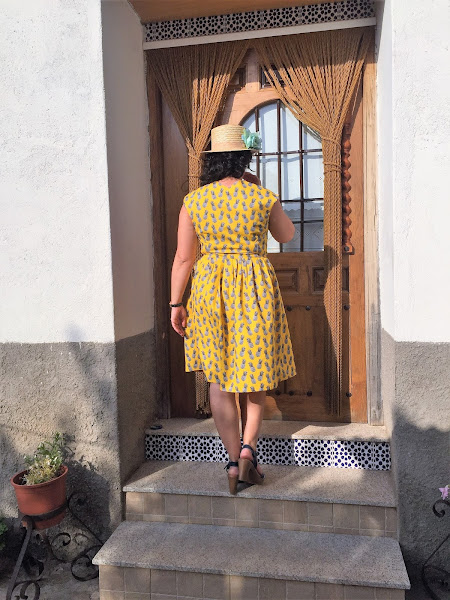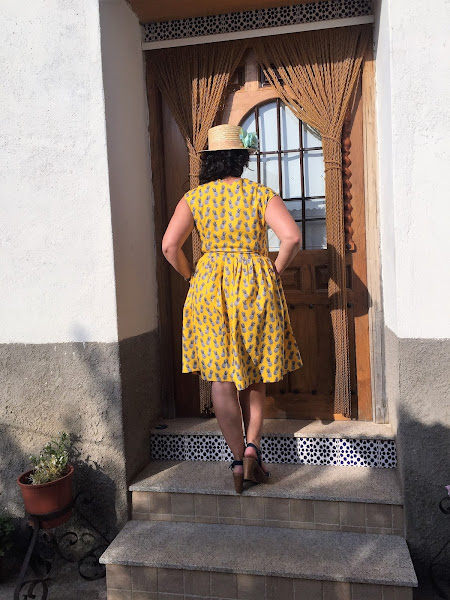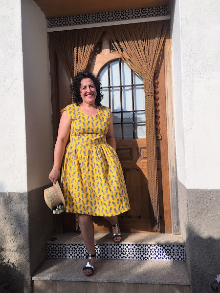 ¿Que os parece el vestido? El de Anna me encantó, pero yo lo quería con un toque distinto, sin cuello que hace demasiado calor, prefería un amplio escote a pico en el delantero y un poquito menos pronunciado en la espalda, con un tirante muy ancho. En la falda hice pliegues en lugar de hacer frunce y eso si coincido con Anna en los bolsillos y las pinzas para entallar un poquito.