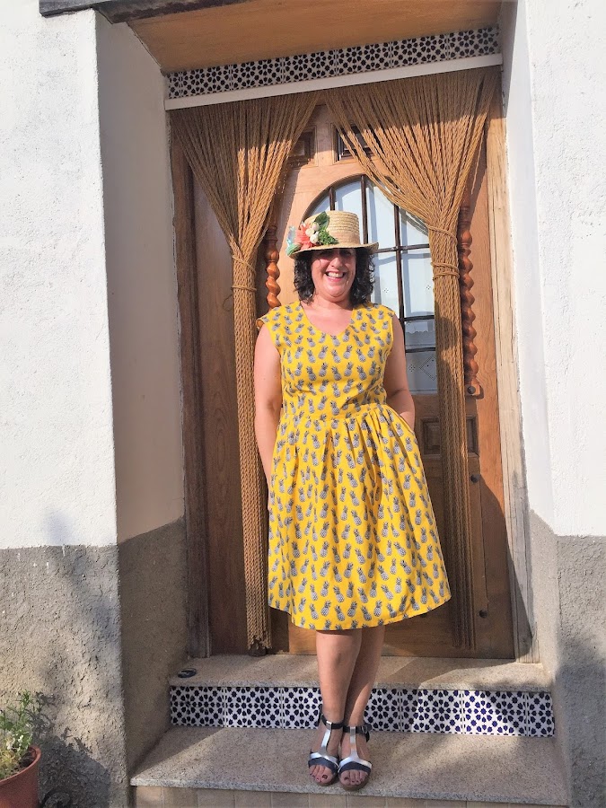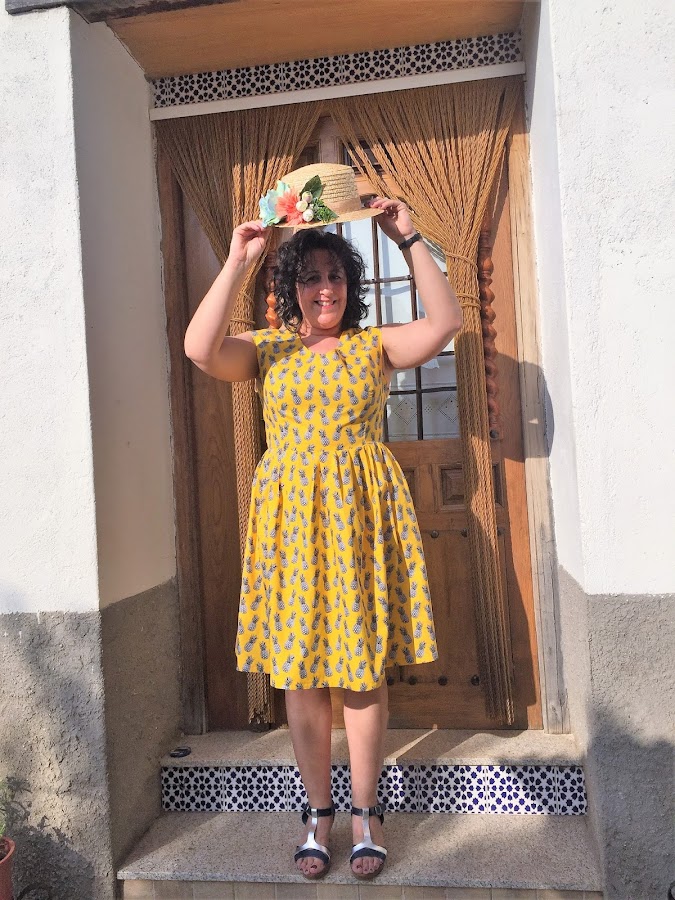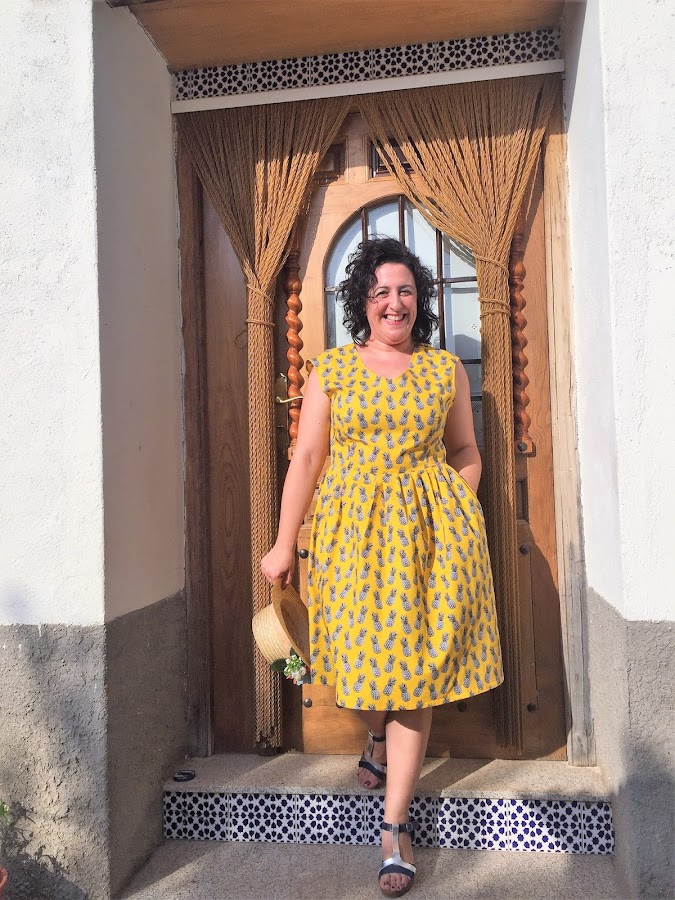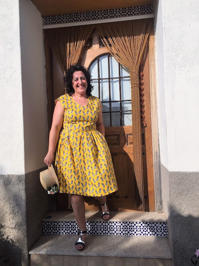 Y quería mi tela de piñas, quería hacer mi vestido de piñas, además amarillo era ideal para el verano y para estas temperaturas que tenemos. Es una tela de algodón tipo patchwork, que es ideal para el verano.