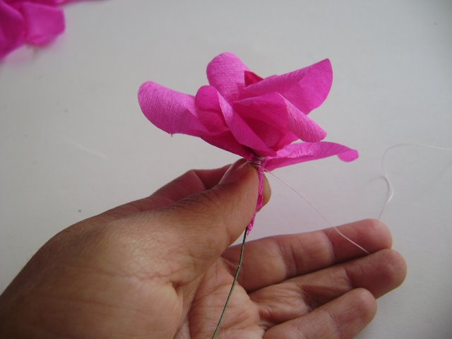 Cada pétalo que se va a gregando según el tamaño se asegura con hilo.