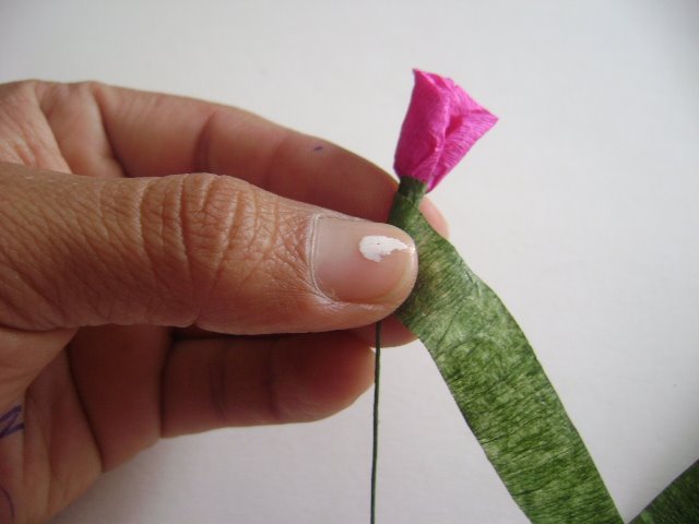 Finalmente se coloca la hoja en un costado de la rosa, si desean una hoja o 2 hojas en ambos extremos de la rosa(a elección), se amarra o pega con kola sintética y se continua cubriendo el resto del alambre con floratape.