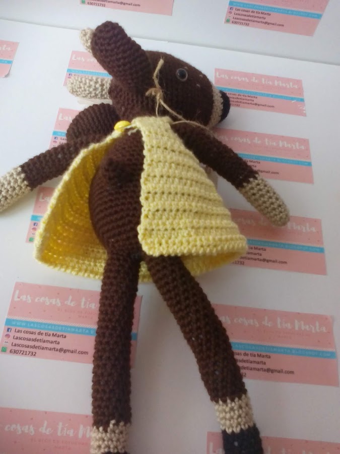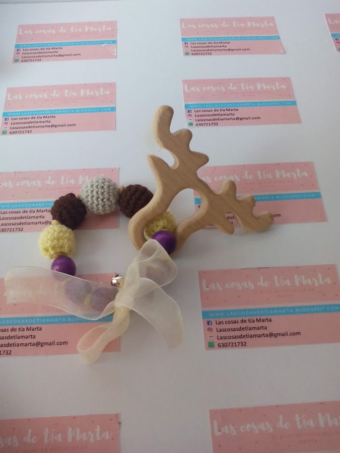 Mordedor con bolas de madera, ganchillo, cascabel y lazo con colores a juego con la muñeca.