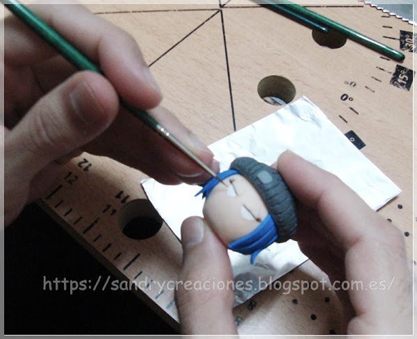 Una vez horneada la figura solo nos quedaba pintar los ojos y los detalles de la boca con pinceles muy finos y bastante precisión