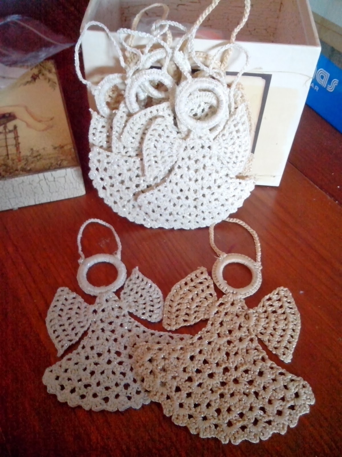 Hoy empezamos con un pack de 6 bolas hechas a ganchillo en tonos beige con destellos brillantes (estos no se aprecian en la foto) y 4 angelitos en el mismo hilo.