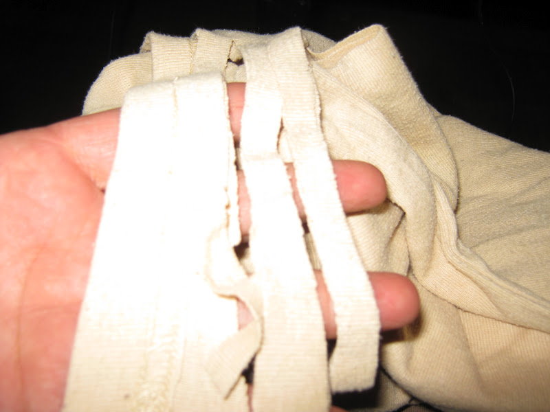 Si quereis probar con una camiseta vieja , teneis que cortarla asi , luego todo el trapillo hay que frotarlo en el canto de algo duro una mesa , silla