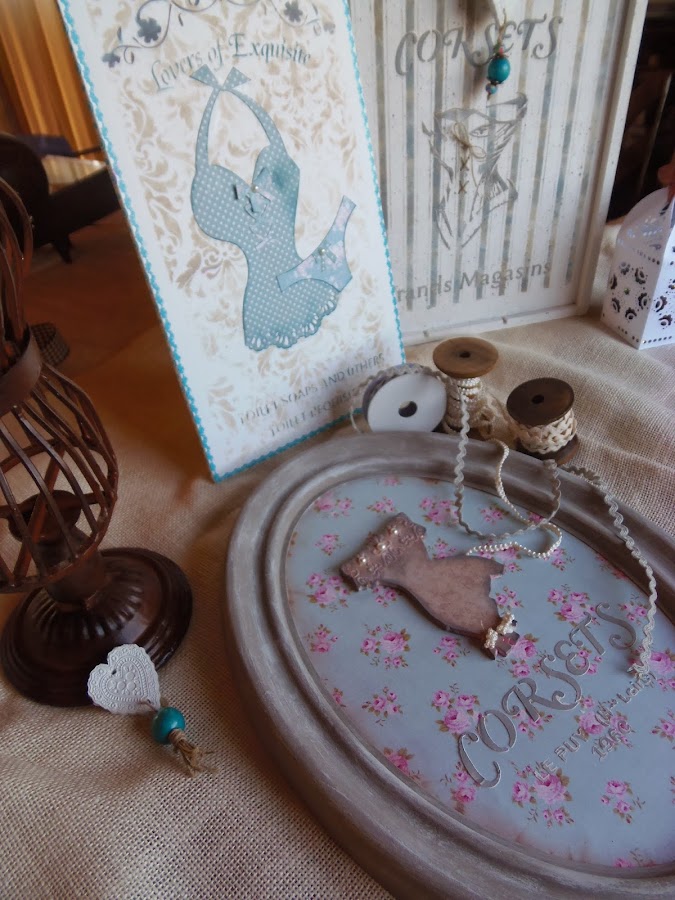 Unas rayas y dos tonos,un lino y un azul grisáceo hacen el fondo de la tapa,el corset en relieve y en los mismos tonos,unos agujeritos para pasar una cuerdecita le dan un toque rústico
