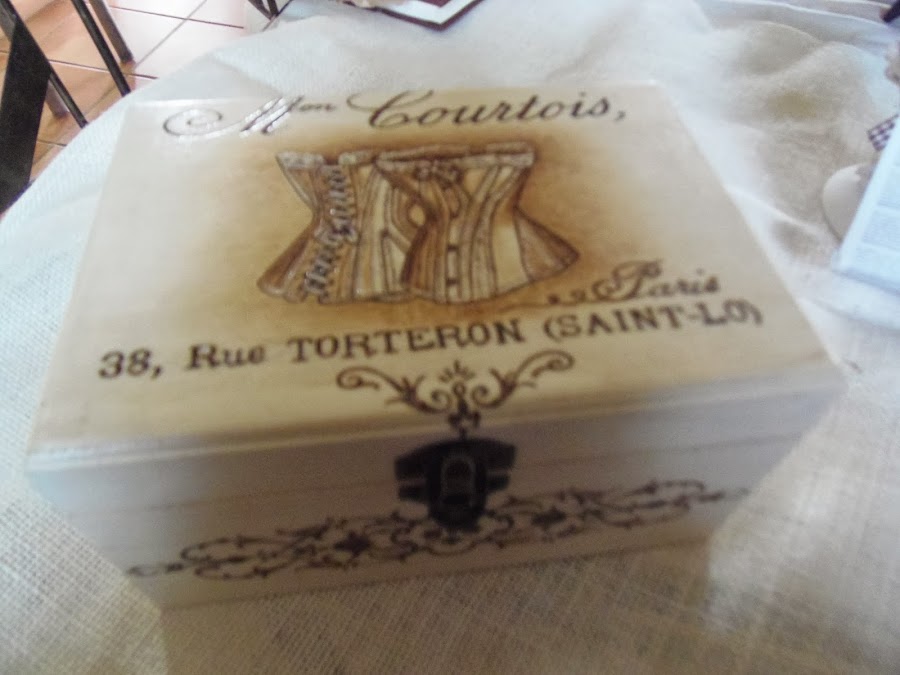 Pero yo fui muy afortunada y recibí de mi amigo invisible,esta maravillosa caja también decorada con corsets pero hechos con pirógrafo,