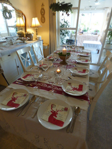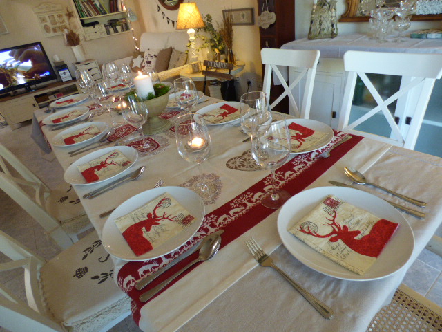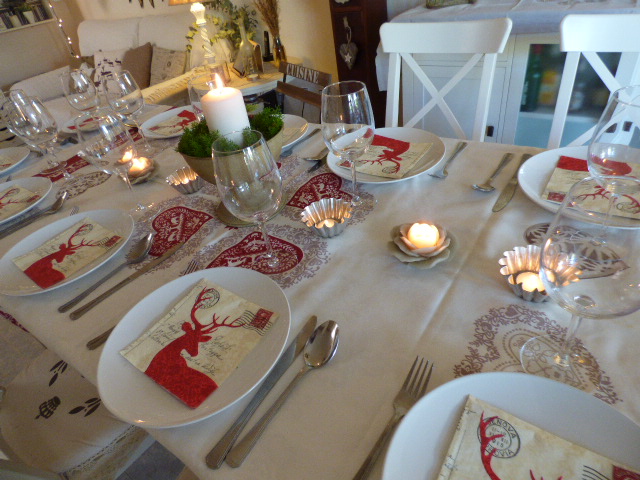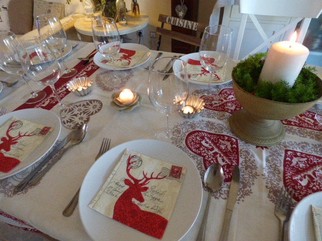 En este día especial, uno de los últimos modelos de servilletas navideñas para decoupage fué a parar directo a la mesa......los tonos rojos le iban de maravilla. Estuve probando varias pero esta en concreto, me encantó como quedaban porque el mantel que puse también tiene pequeños ciervos muy parecidos a los de la servilleta.