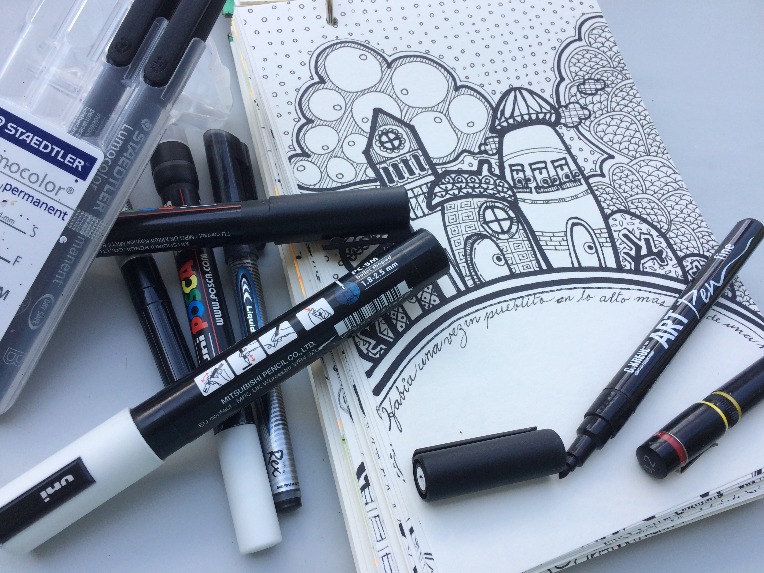 Tinta/bolígrafo/estilógrafo...: Perfecto para garabatos. Con diferentes grosores en la línea se pueden trabajar hasta claroscuros. Un buen ejercicio para la mano, tirar líneas y sin borrar.