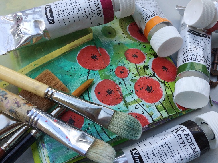 Acrílico: Podemos hacer veladuras/transparencias pero también es cubriente, lo que da mucha libertad de acción. Como se necesitan los pigmentos, pinceles, agua, recipiente... no es muy práctico si estamos "de camino"/fuera de casa.