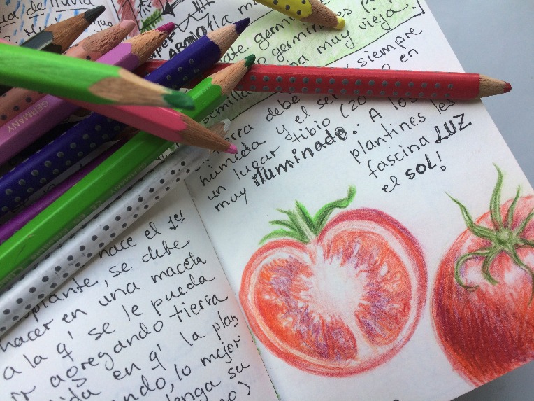 _ Depende del medio que en el momento se tenga a mano. Lo importante es hacer, es desarrollar la página cuando se sienta el deseo de hacerla, que me gustaría en acuarela pero estoy en el bosque y no las traje conmigo, pues no importa lo hago a lápiz.