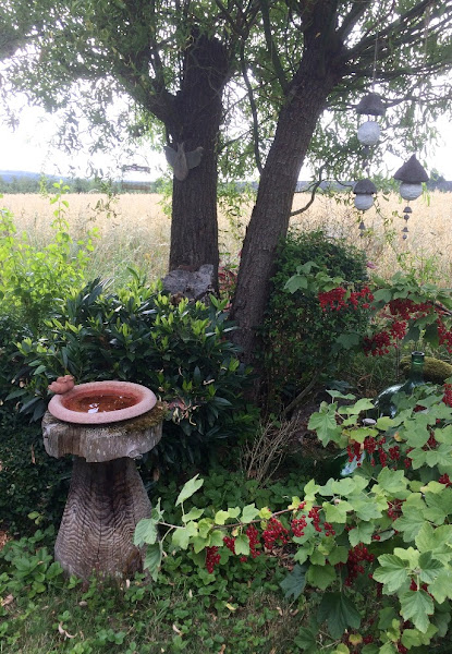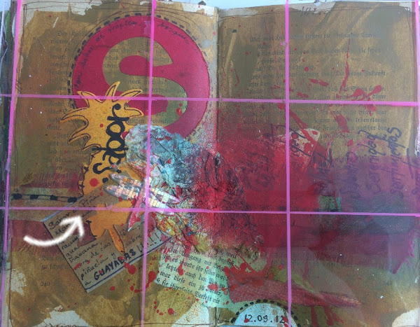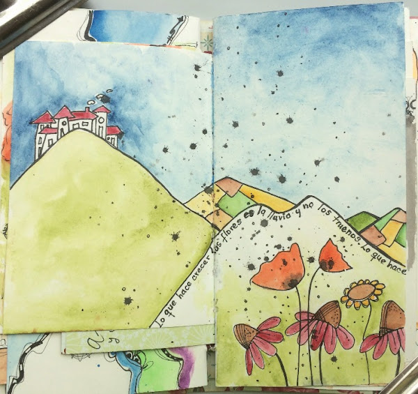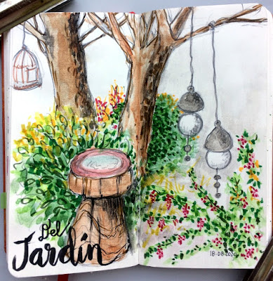 Es una página sencilla con una composición en U/V marcada por la forma del árbol, la U la hace el movimiento del ojo, al comenzar por la izq. con la jaula, seguir con la mesa/tronco y terminar en los colgantes. tiene movimiento, tiene ritmo... y a la larga es sólo una aproximación a una partecita de mi jardín que veo desde mi taller. No necesitamos si no tener los ojos abiertos para realizar nuestras páginas.