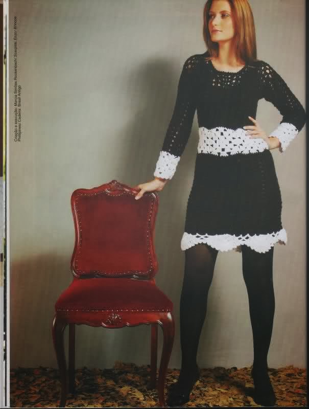 En primer lugar tenemos a Beatriz (NikkiCmptos en facilisimo.com) que, en su blog Los gráficos del gato, nos deja el patrón para realizar este precioso vestido de ganchillo. ¿Os dais cuenta cómo lo realza la combinación de los dos colores? ¡Cuánta vida le da al vestido haber hecho la cintura, los puños y el bajo ondulado en blanco!