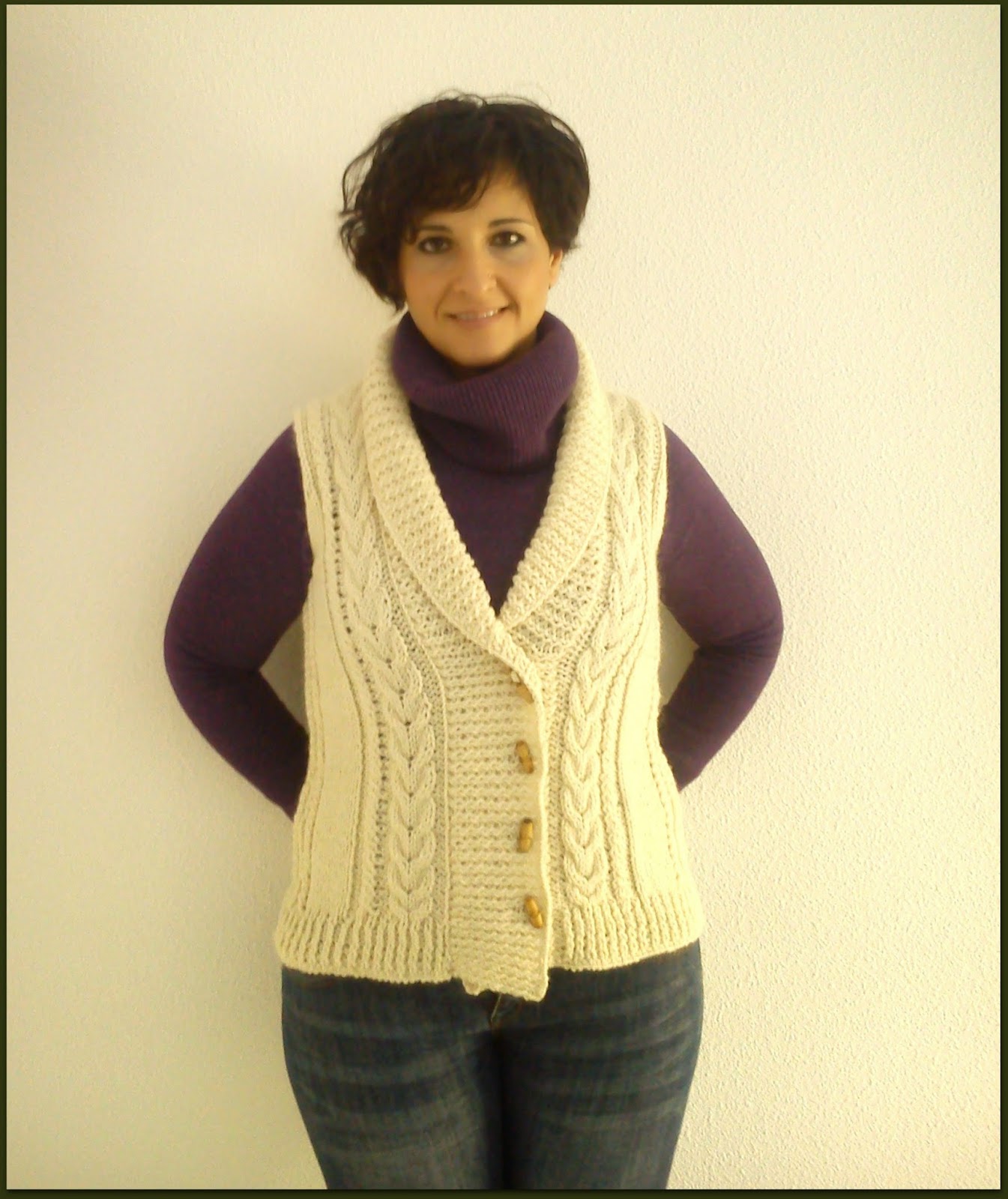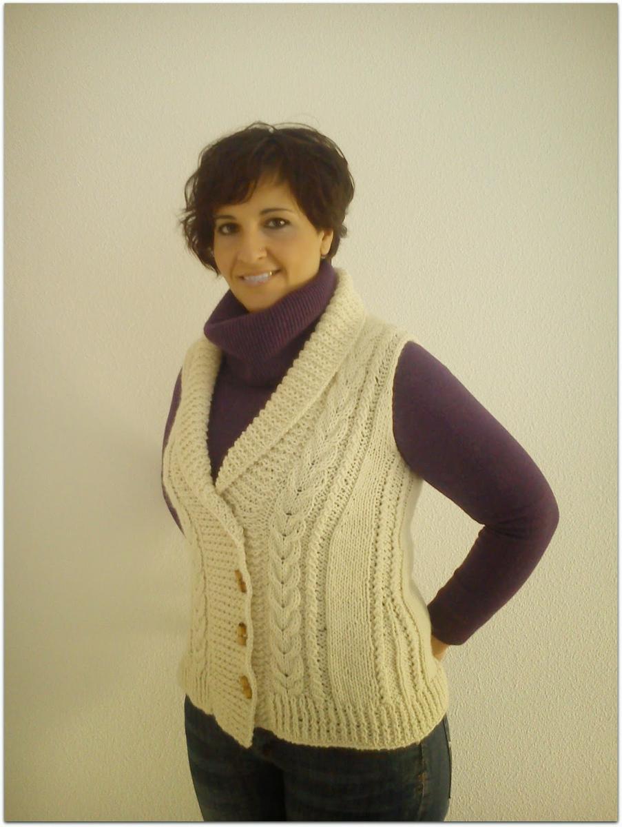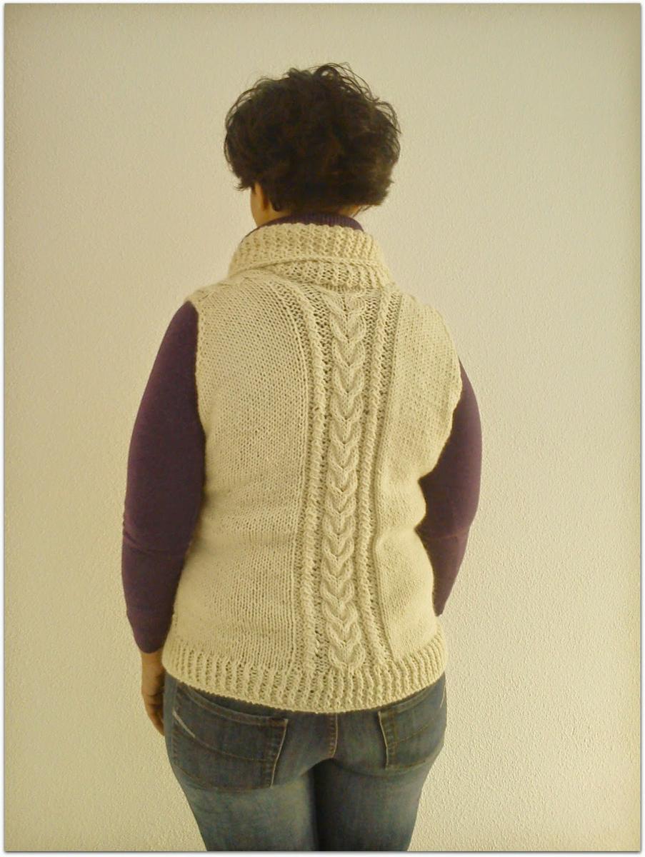 Este no es mi color, para nada. No me acababa de convencer para un jersey y para la rebeca , pues como que no me daba para las mangas. Entonces se me ocurrió hacerla de este tipo para poder llevarla con un jersey debajo porque la verdad es que aquí donde vivo ahora, no hace nada de frío y yo me empeño en hacerme prendas de lana abrigadas y después se las pone Rita La Cantaora porque ¡¡no hace frío!!