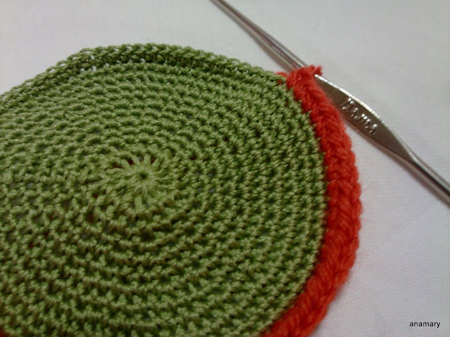 es muy fácil de hacer y como la lana es gruesa acabamos muy pronto,comenzamos con el hilo verde,hacemos un circulo,y vamos haciendo vueltas hasta tener unos 8 cms. más o menos,este hilo es de algodón del nº 5 trabajado doble ,