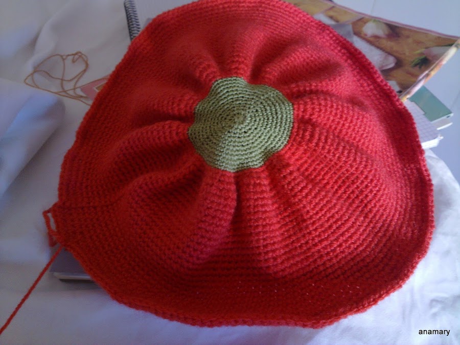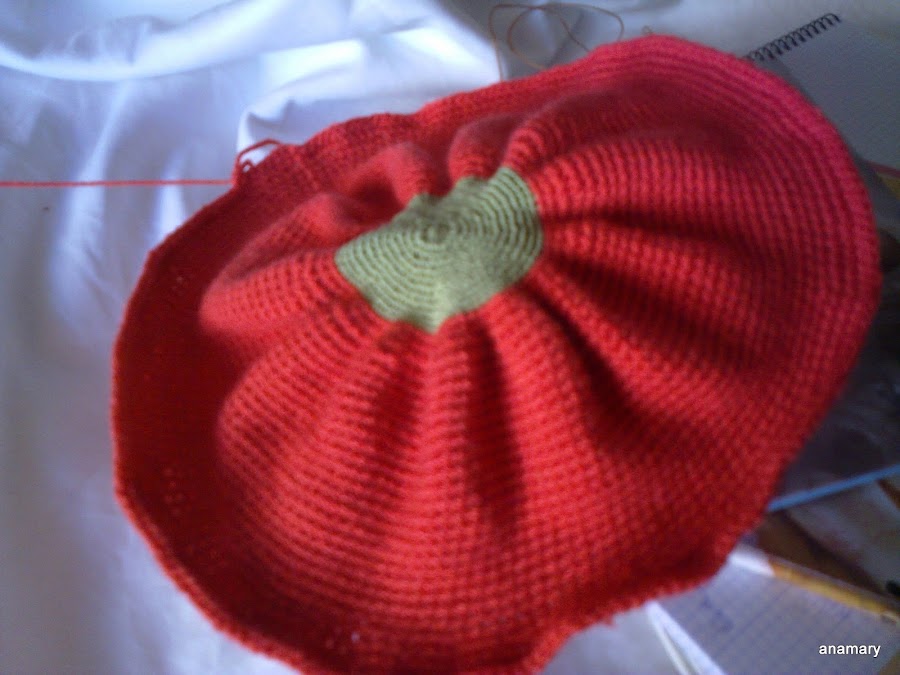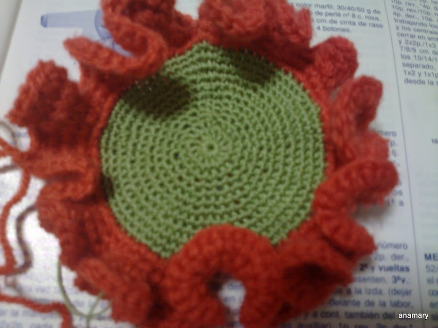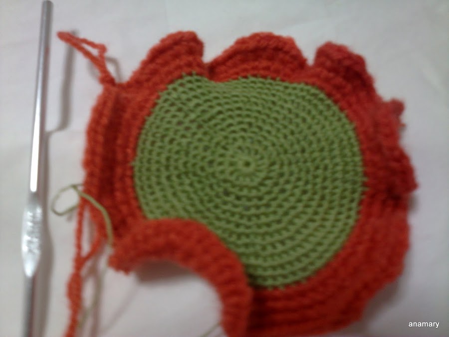 es muy fácil de hacer y como la lana es gruesa acabamos muy pronto,comenzamos con el hilo verde,hacemos un circulo,y vamos haciendo vueltas hasta tener unos 8 cms. más o menos,este hilo es de algodón del nº 5 trabajado doble ,