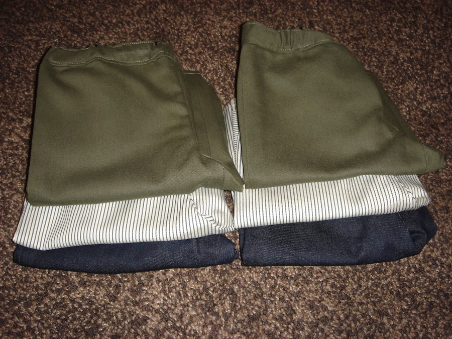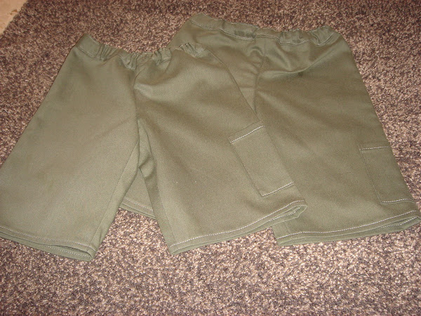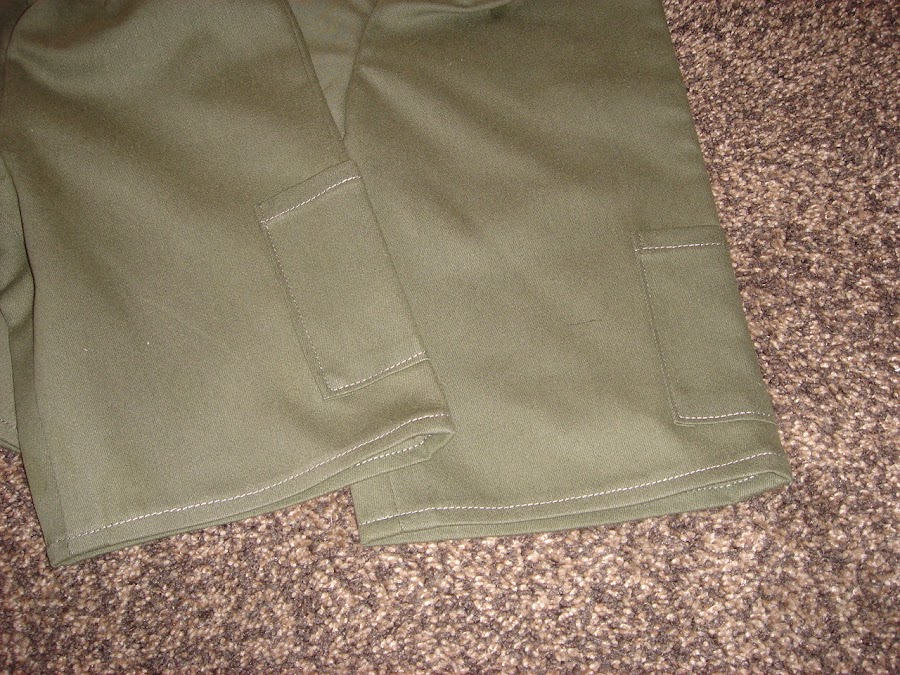 Las terceras estan realizadas en tejido de gabardina de algodon en color verde-caqui , tambien le he añadido un bolsillo el un lateral de pierna.