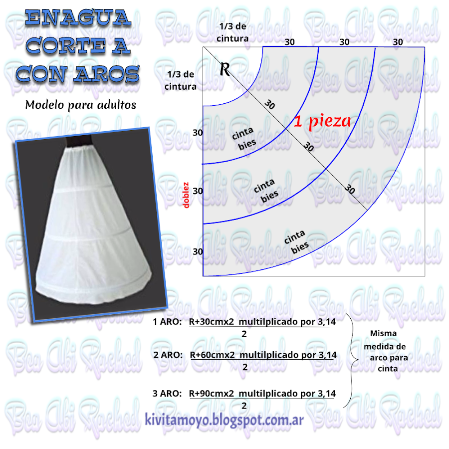 Para calcular la medida de los aros resolvemos el perimetro de cada seccion como un circulo, y luego se divide en 2, ya que es media falda en su vuelo. Esto es: Radio, mas largo del panel, por 2, por 3,14 y el resultado lo dividiremos entre 2, por ser es medio circulo.