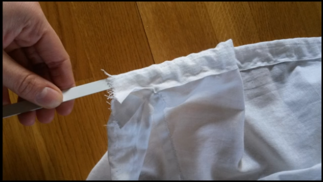 Dividiremos el largo de la falda en tres. Cada franja medira unos 30 cm, y en esa marca se aplicara una cinta al bies como un canal, por donde se introducira el fleje de armado. En la cintura ira un cordon para ajustar. El genero usado puede ser un algodon resistente. El calculo de tela a usar sera: un rectangulo que mida el lado del cuadrado del patron para el alto, y esta media por 2 para el ancho.
