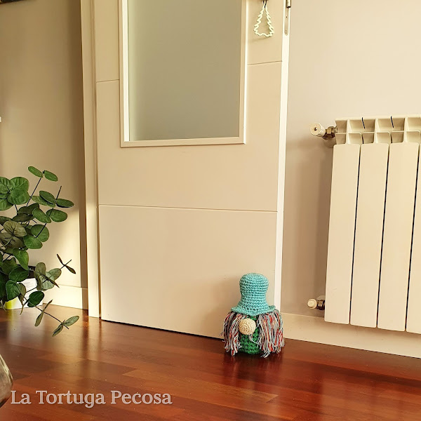 Realizado con material reciclado: la base una botella de un refresco de 2L reciclado, con arena por dentro (para hacer de contrapeso) y cerrado todo con cinta aislante. A partir de ahí, coser en crochet: 1º el cuerpo, luego el pelo, luego la nariz, y luego el sombrero. Y tanto para la nariz como el sombrero es necesario rellenar con guata.