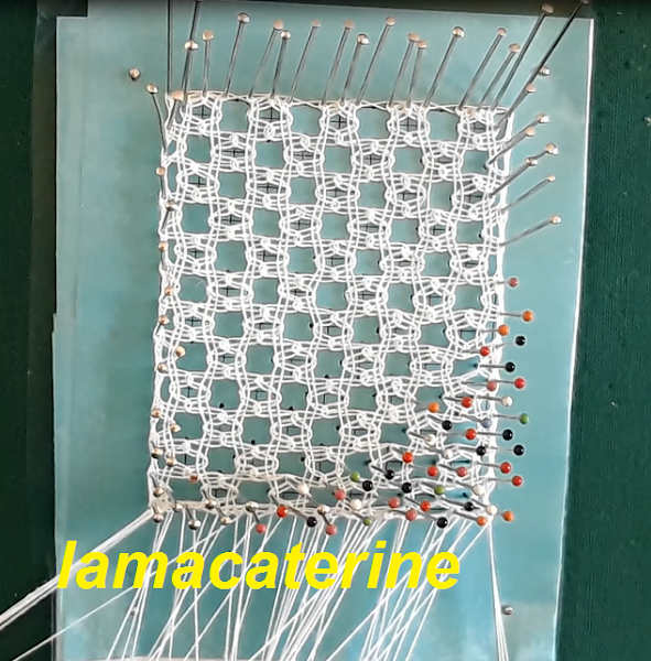 En este vídeo os muestro otra variante, en este caso he trabajado todos los cruces en punto de tejido (cruz-vuelta-cruz) tanto los que llevan alfiler como los que no llevan. El resultado ha sido este.
