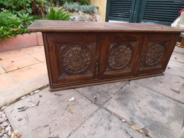Mirad el mueble que me ha dado. Quiero integrarlo en mi habitación de trabajo, porque dentro me cabrán un montón de cosas, por lo que creo que sólo lo pintaré de color claro....luego lo lijaré mucho para que destaquen los labrados de las puertas. No lo veo con decoración estampada...ni siquiera con estarcidos....