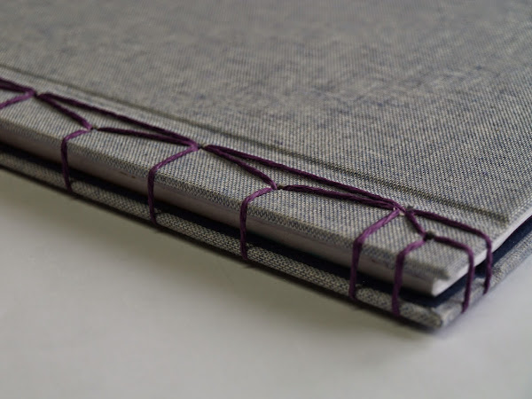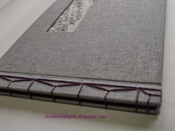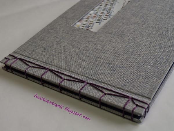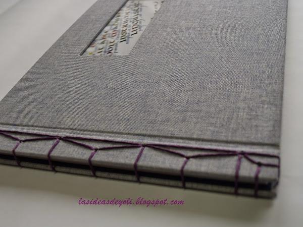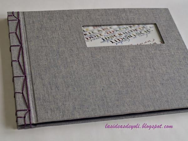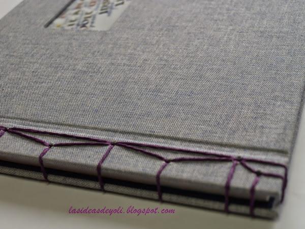 Es un cuaderno realizado con tela vaquera de encuadernar, cosido japonés y una ventana en la portada donde en mi caso he puesto una foto de mi trabajo.