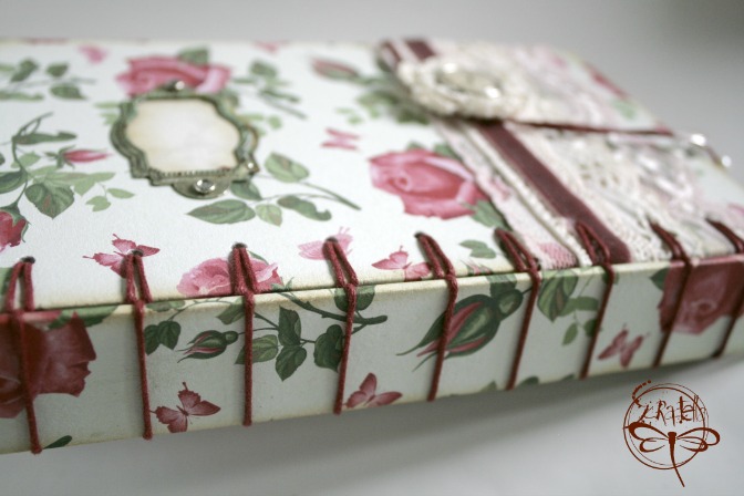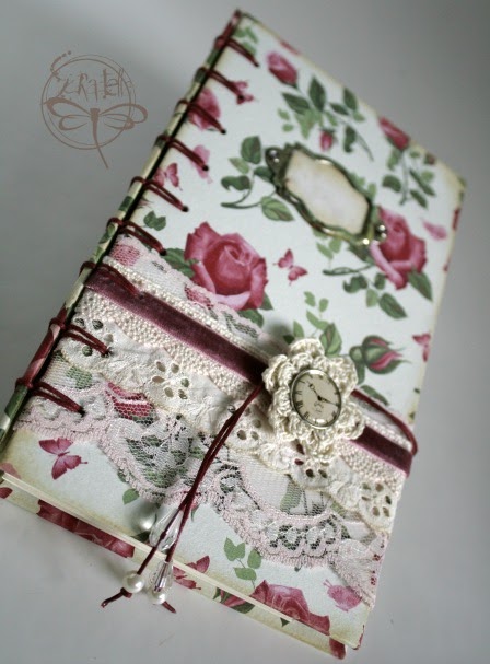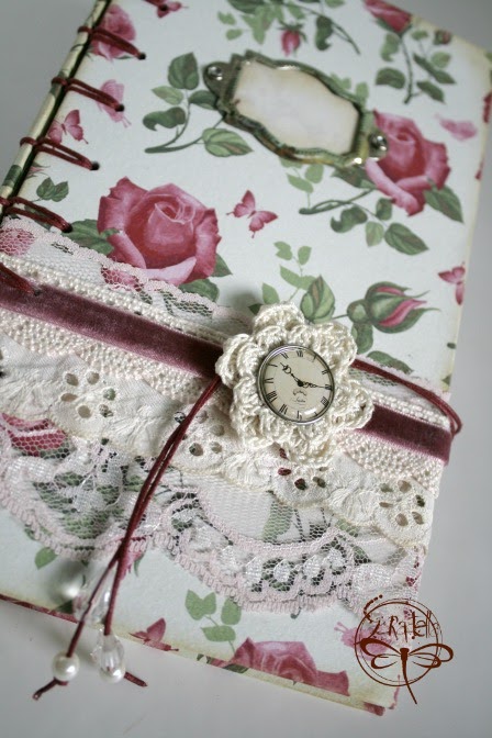Que cuando terminó de hablar yo ya estaba pensando en qué papeles usar! (jajaja) bueno, casi. Porque eso siempre es un largo camino, a qué si? más tiempo llevo decidiéndome en qué materiales usar que en hacer el proyecto! esta vez, estos papeles de rosas y mariposas me dieron el tono... debía ser romántico, donde los encajes no debían faltar, perlas, y hasta una flor en ganchillo hecha especialmente para adornar este libro!