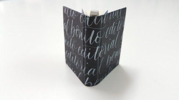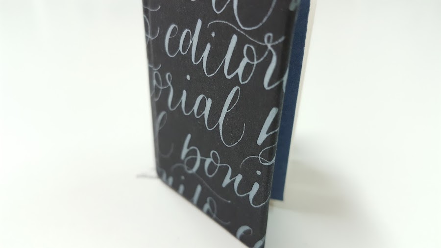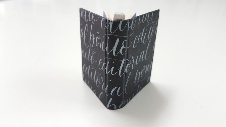 Encuadernado cartoné, guardas grises a juego de la tinta, papel Fabriano, cabezadas y cinta de registro en gris. Tamaño 4.5*3.5