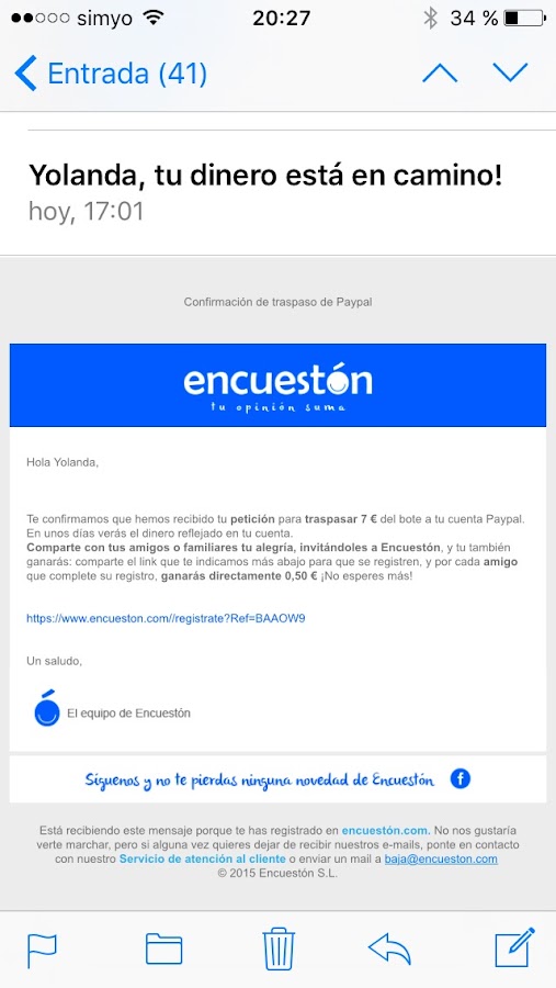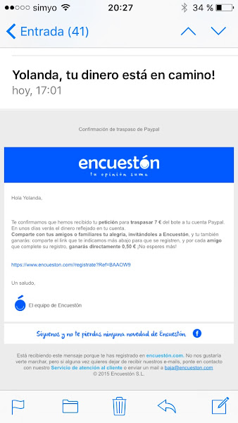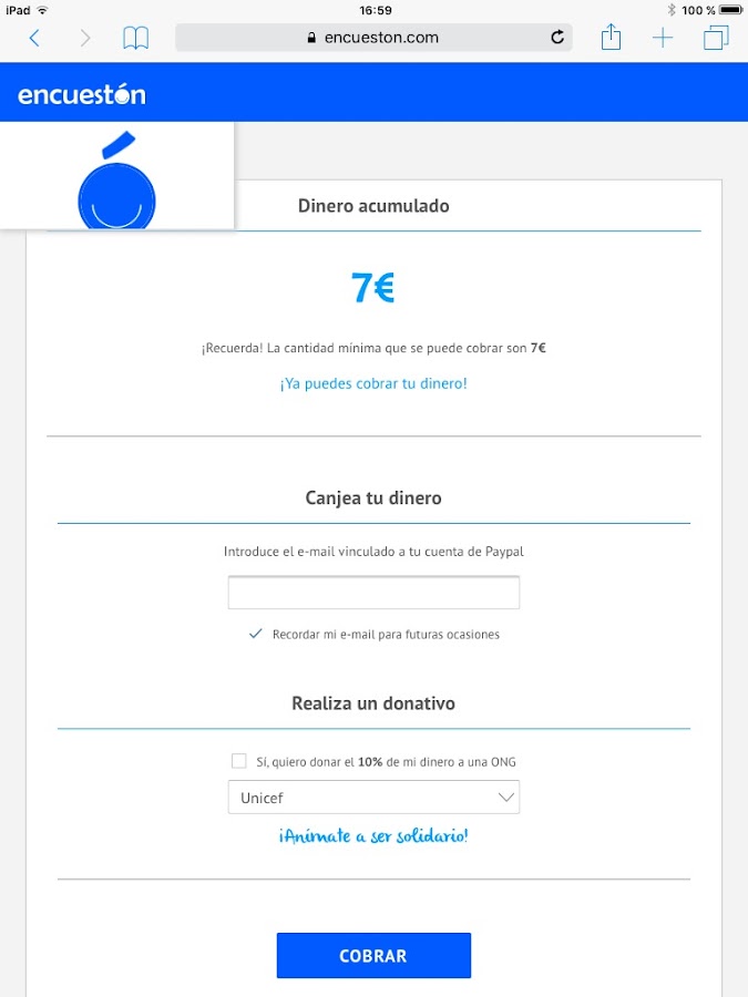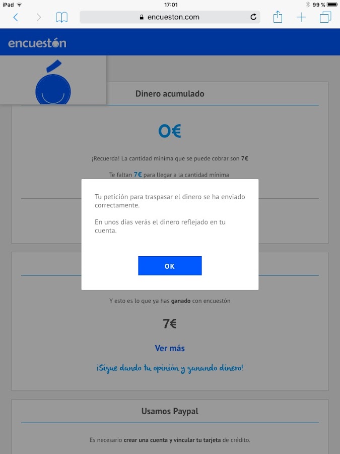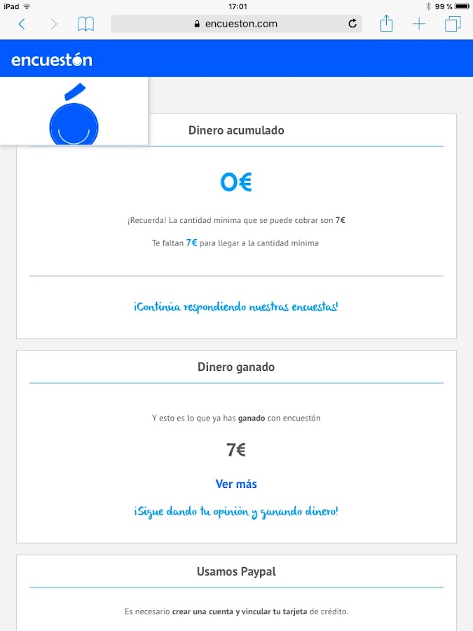 Se trata de Encueston, como su nombre ya nos da a entender se trata de una página para realizar encuestas, en las cuales se nos va acumulando dinero en nuestra cuenta virtual, y una vez llegados a los 7€ los podremos canjear traspasándolos a nuestra cuenta de Paypal.