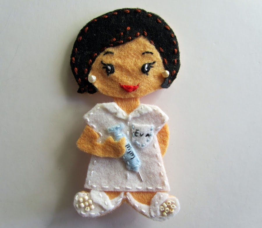 Hola! Os muestro un broche de fieltro que hice para mi suegra. Ella trabaja en el sector sanitario y por eso la he representado de acuerdo a su profesión. Os explico un poquito cómo lo he hecho: Par ...