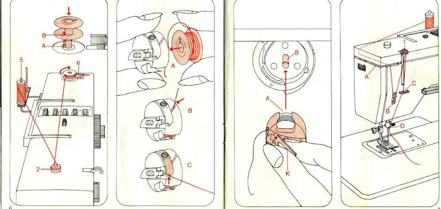 y como se que muchos de vosotros teneis problemas con el enhebrado, os dejo el esquema para enhebrar esta máquina tanto en el hilo superior como el enhebrado y la colocación de la canilla.