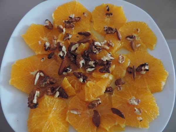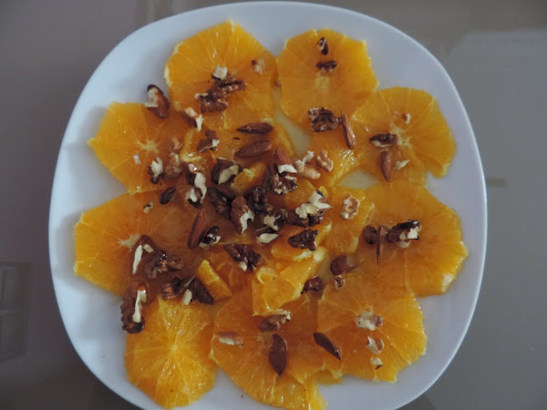 Se pelan las naranjas y se cortan en rodajitas, se disponen en un plato llano y se le añade encima nueces peladas y almendras también le he puesto algunas, luego le añado miel líquida por encima y la dejo reposar en la nevera una hora más o menos, y ya está, es facilísima, si quieres también le puedes añadir, dátiles, platano a rodajas, fresas, canela, etc. de cualquier forma está deliciosa.