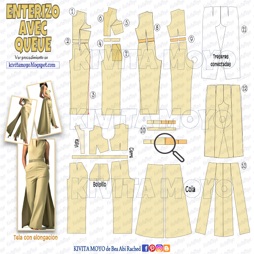 Unir las dos mitades de la cintura delantera (amarillo) con las dos dela parte trasera (naranja) y empalmarlas superponiéndolas en la parte superior ( lupa) y haciendo coincidir la parte inferior. Esto es para crear una cintura recta que respete la medida de la linea de cintura. Al tratarse de una tela que cede se adaptara luego a las medidas recuperando esos milímetros que superpusimos en los patrones.
