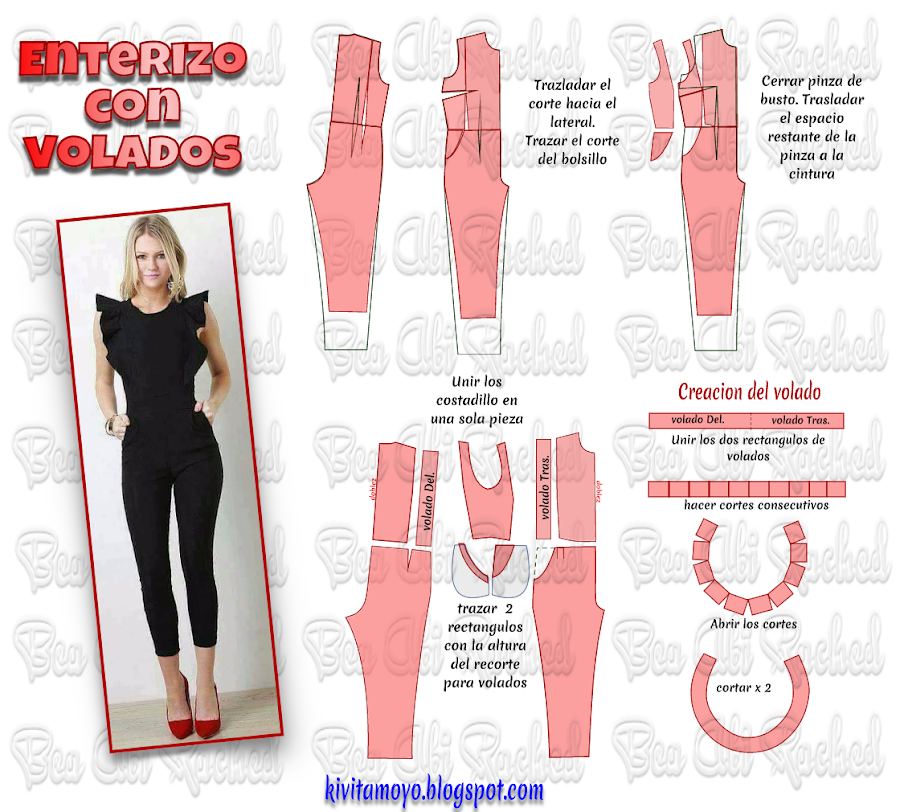 Desde el patron base del cuerpo y el pantalon diseñar el enterizo. Se desplazara la pinza hacia un lateral para crear el costadillo mas cercano al borde del hombro.Trasladar la pinza de busto al hombre para crear el recorte. El sobrante del vertice de la pinza de busto se trasladara a la cintura. En el mismo recorte ubicar el bolsillo delantero. Las pinzas del pantalon se convertiran el pequeñas tablas. Tomar la medida del recorte central para dibujar los retangulos de referencia del volado. Unir en una sola pieza los rectangulos del delantero y del trasero y se le practicara sendos cortes que se abriran describiendo una curva para los volados circulares.