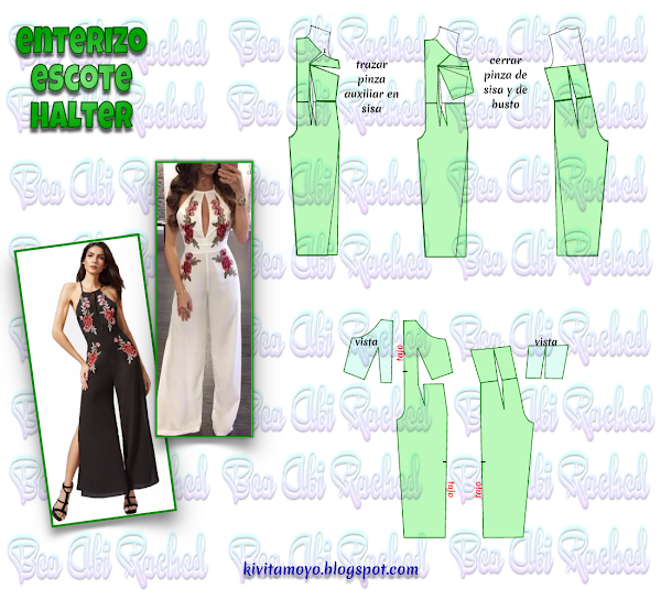Una vez mas usamos la pinza auxiliar en la sisa para evitar que desboque, y trasladamos junto con la pinza de busto a la pinza de entalle de la cintura. La espalda sera descubierta y entallada. Coser las partes del cuerpo con una vista completa. Y dejar en el delantero una abertura desde el escote hasta la cintura. En el modelo los apliques bordados cubren las pinzas. En el lateral dejar sin coser desde el bajos hasta media pierna pára crear un tajo.