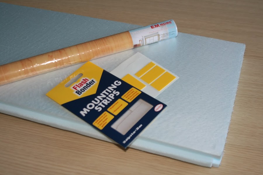 Así que, pensando en otras alternativas que nos solucionasen el problema, se nos ocurrió emplear una plancha de poliestireno extrusionado, que pesa poco y además es baratito (unos 2€, si no recuerdo mal, la plancha de 2,00x0,50m). El poliestireno lo cortamos a la medida que necesitábamos con un cutter.