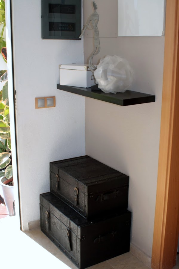La última foto que incluyo es para que se vean los dos baúles nuevos que he colocado en la entrada. Estos no los he hecho yo, pero lo enseño porque me han salido tirados de precio. Los he comprado en una tienda en la que tienen artículos de decoración y cosas varias donde, de vez en cuando, se venden las cosas a 3€ el kilo. Los dos baulitos, de madera y piel, que yo los había visto anteriormente en la tienda y rondaban los 40-50€ cada uno, me han salido por 24€ los dos. Ya veis, todo un chollazo. Por si alguien le interesa, la tienda en la que los adquirí se llama La Cestería, se encuentra en Sanlúcar la Mayor (Sevilla) y tienen hasta página web y todo (http://www.lacesteria.es/inicio.html). Es más, si quieres incluso puedes hacerte fan en Facebook (http://www.facebook.com/home.php?#!/pages/Sanlucar-la-Mayor-Spain/La-Cesteria/92859382303?ref=ts&ajaxpipe=1&__a=26)
