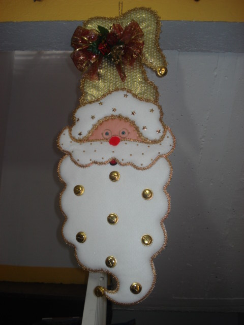 Santa en dorado, con gran contraste en la aplicación de moño rojo, mide 65 cm de largo.