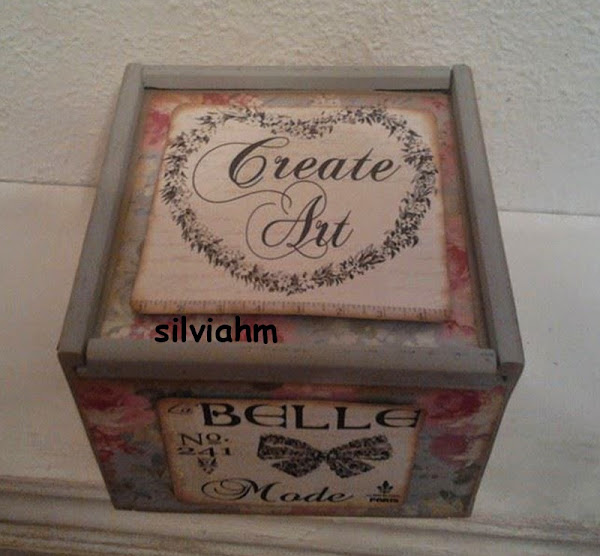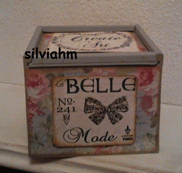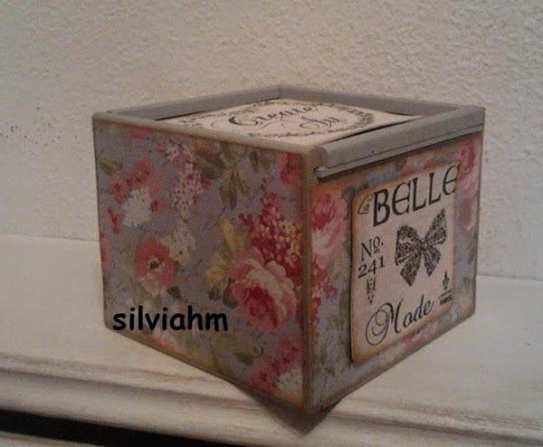 Empecé reciclando esta caja de madera, en su momento traía un queso dentro. Una mano de acrílico azul claro, unos papeles comprados en Madrid y unas láminas de découpage.
