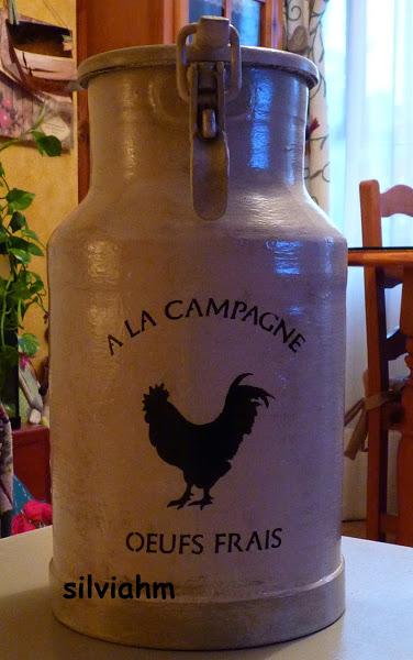 Y otra plantilla comprada a Lucía, fue a dar en esta lechera que teniá pintada con flores. Una mano de balnco roto, pátina y estarcido.