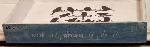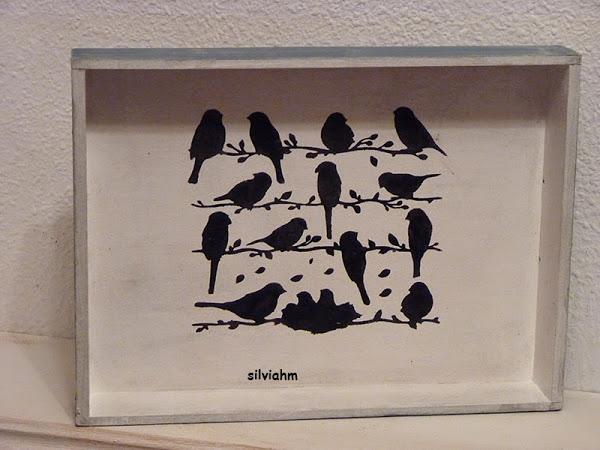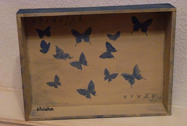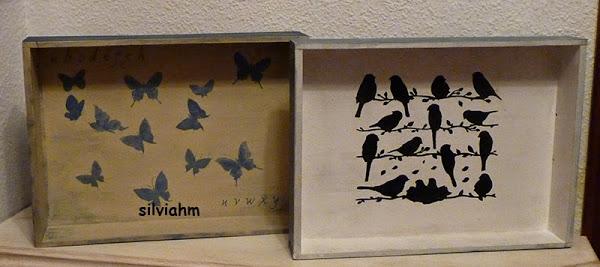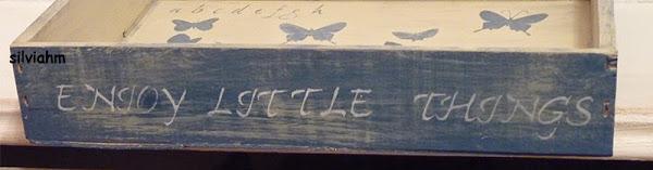 Y, como no, tenía que aparecer por aquí alguna caja de gambas reciclada. Una amiga está experimentando con la Cameo y me ha regalado un montón de plantillas. Algunas de ellas las he utilizado aquí. Ya están recicladas en bandejas donde colocamos los libros que estamos leyendo.