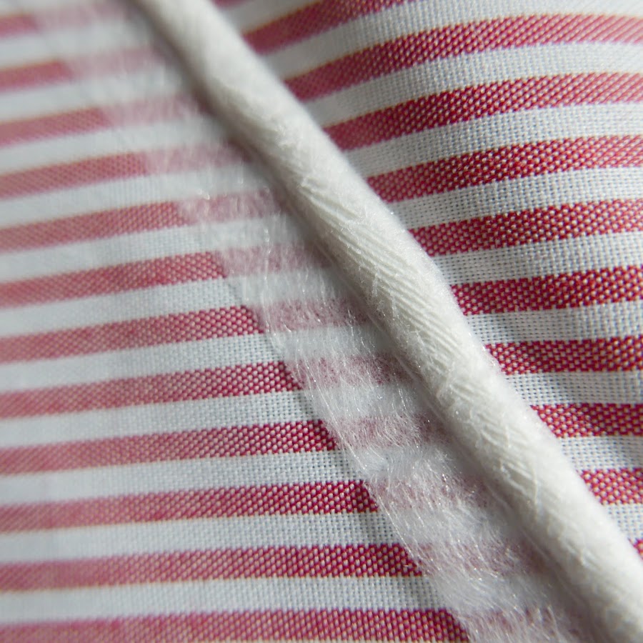 Este es todo un hallazgo para quienes les gusta poner vivos en sus proyectos. Se trata de un cordón de algodón con una capa de entretela, tipo papel que envuelve el cordón. Como veis, la forma de este color es igual al vivo que podemos encontrar ya hecho en la mercería.