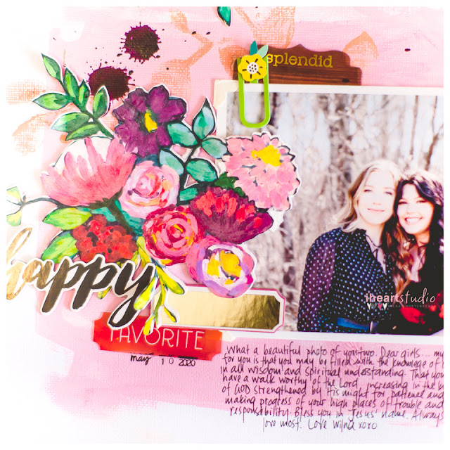 Diseñé mis propios diseños florales y los imprimí en papel de acuarela con mi Epson XP-15000 e imprimí y corté con mi cameo de silueta. Dibujé el fondo con una placa Gelli y simplemente terminé el diseño con fotos, mis diseños florales y adornos. Puede ver un tutorial completo (y una lista de productos) de la página aquí: https://www.youtube.com/watch?v=4xfJE5HI-IU