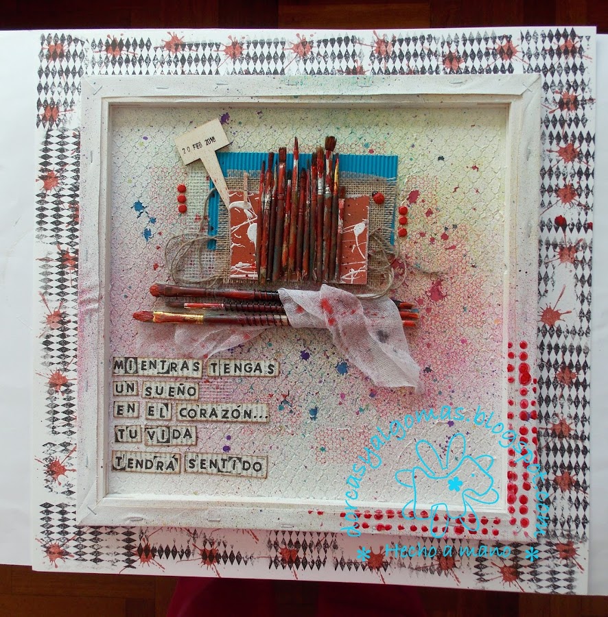 Para nada soy una persona que necesita comprarse los últimos materiales que salen al mercado. Lo pienso mucho antes de invertir en materiales nuevos, si realmente me pueden ser útiles, si los voy a usar de continuo o es una moda pasajera. Me gusta utilizar cosas cotidianas, tengo una caja grande que llamo cajón desastre y en ella guardo todos aquellos materiales que me pueden servir para mis páginas de Art Journal. Bueno empecé con una y ahora tengo 2 cajas, una la tengo en el local del colectivo de Pintores Desde las Emociones.
