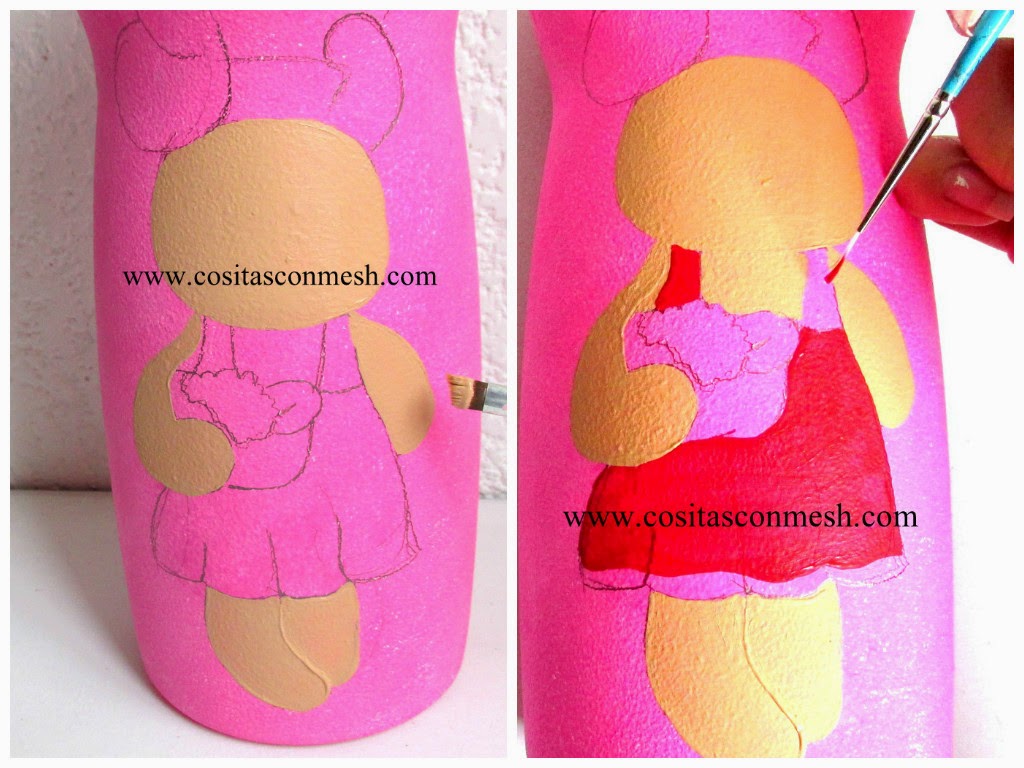 7.-Luego de pintar el cuerpito, pintamos el vestido de rojo, para pintar el tirante del vestido usare pincel liner ya que es un espacio mas pequeño, y se necesita de un pincel mas fino.